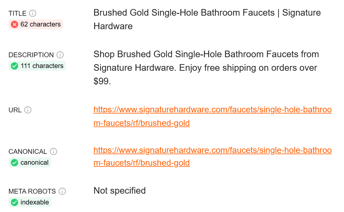 In practice, when an active indexable refinement was chosen (i.e., Brushed Gold), it would update the URL to include the refinement. In the case of the example below, if Brushed Gold were chosen under the category Single-Hole Bathroom Faucets, the URL for the category (https://www.signaturehardware.com/faucets/single-hole-bathroom-faucets) would update to the URL for Brushed Gold Single-Hole Bathroom Faucets (https://www.signaturehardware.com/faucets/single-hole-bathroom-faucets/rf/brushed-gold)