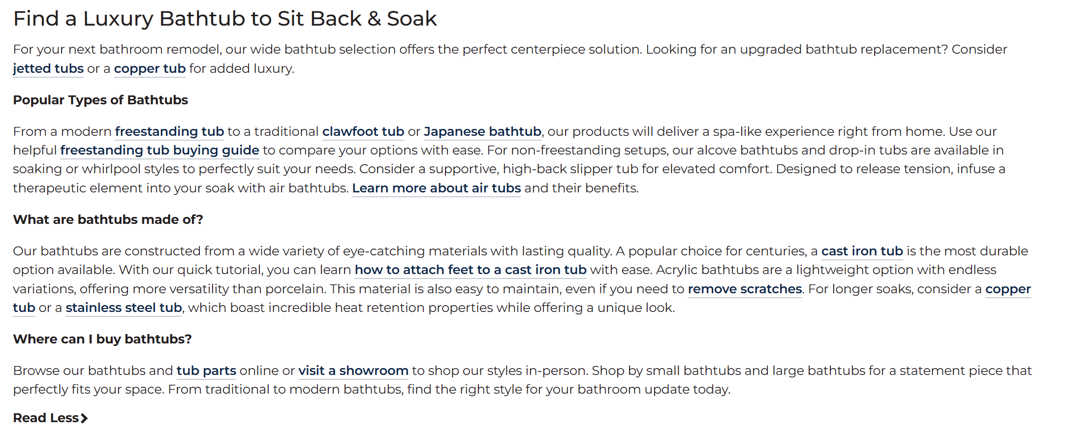 We started with bathroom collections, including faucets and bath accessories, and expanded to vanities and tubs. Once they launched, I QA’d internal links and on-page elements.